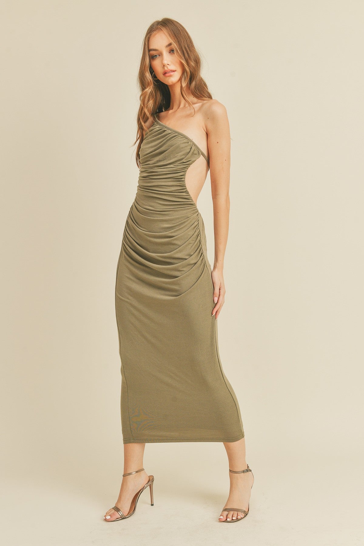 Vestido verde oliva tela stretch de un hombro y espalda descubierta con drapeados y largo a los tobillos.