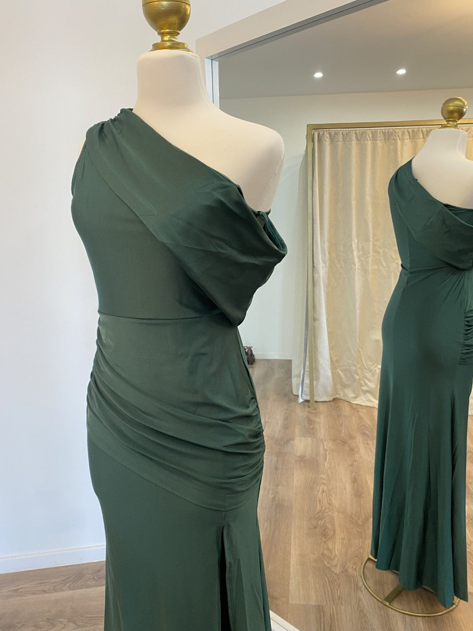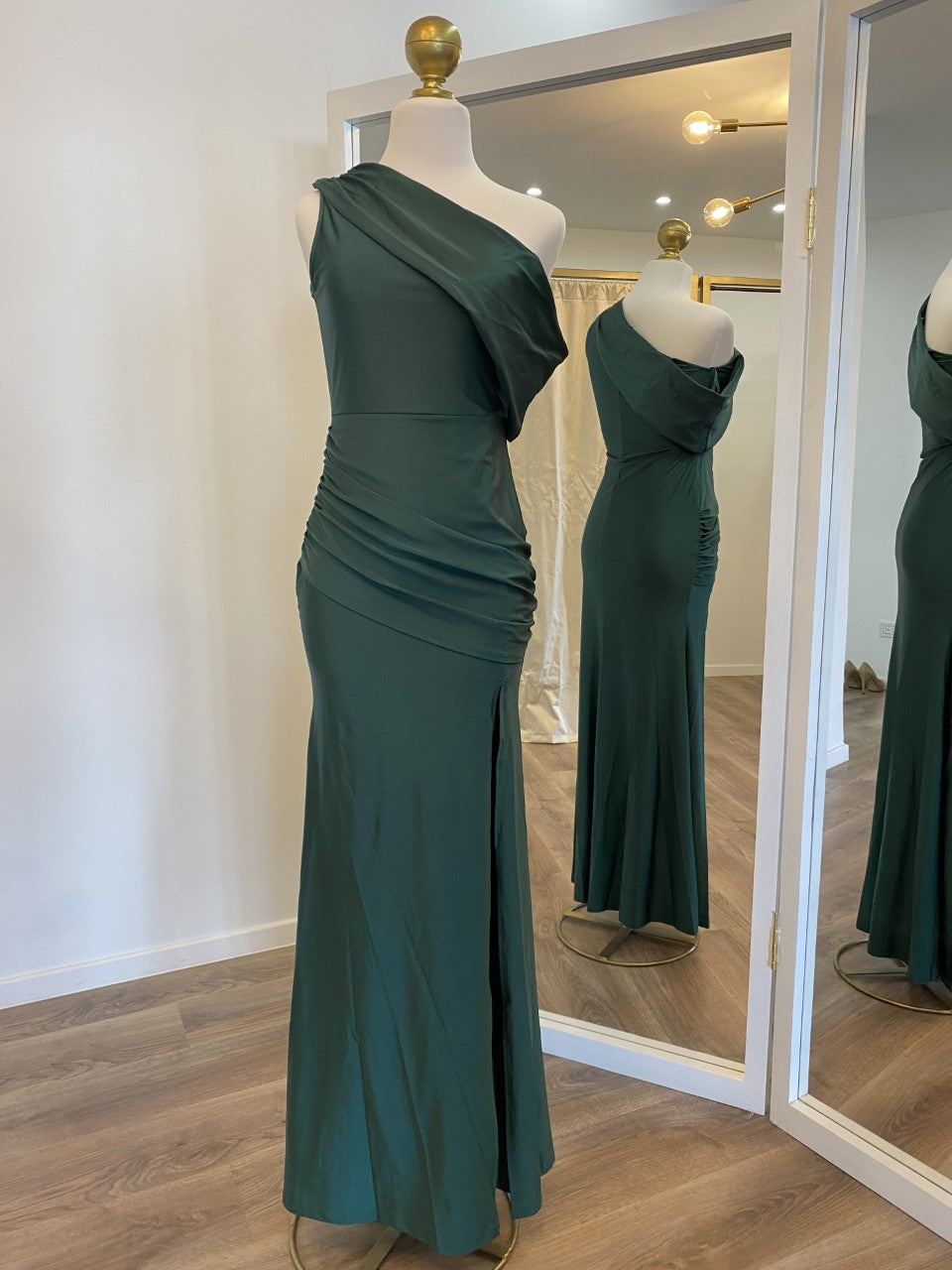 Vestido sirena en tela stretch , con pequeño drapeado en cintura, un hombro caído y pierna abierta. Muy cómodo y versátil.